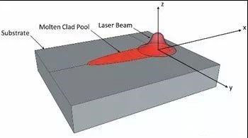 激光熔覆所需要的激光器功率要達(dá)到數(shù)千瓦級(jí),這意味著上百萬束手持紅色激光束同時(shí)聚焦在不到一枚硬幣大小的區(qū)域。此時(shí)聚焦在金屬表面產(chǎn)生的熱量足以把基體熔化,對(duì)于鋼來講,表面溫度能夠達(dá)到2500~3000℃。針對(duì)不同的材料,在進(jìn)行表面熔覆時(shí)需要的熱量不同;但是對(duì)于同種材料來講,無論是采用激光熱源還是電弧熱源,都需要將母材加熱到熔化溫度,但是由于激光束是高度集中的熱源,因此其所需要的總能量要低于弧焊熱源。激光熱源只作用在需要的區(qū)域,而弧焊熱源中有很大一部分熱量要消耗在非加熱區(qū)域,所以在熔化金屬方面激光熱源更有效率 。簡(jiǎn)單的講,電弧熔覆就像是探照燈,而激光熔覆就相當(dāng)于在必要的時(shí)候閃光提醒的激光束。與焊接相類似,激光熔覆時(shí)熔化的區(qū)域也叫作在熔池。